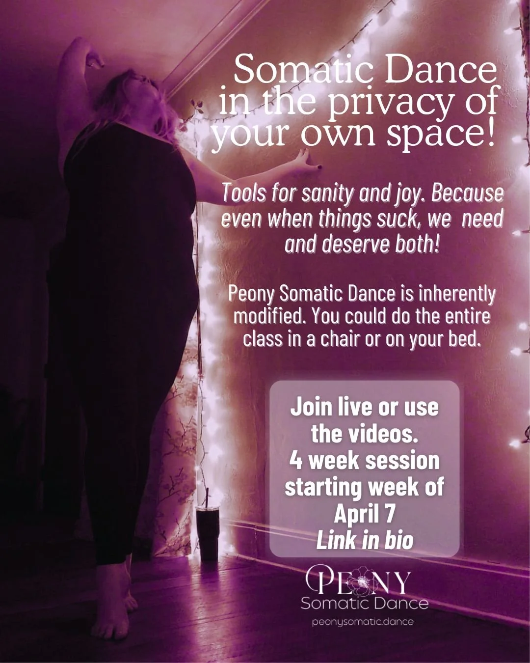 Thursday, Peony Somatic Dance (60 minutes). This is the evening session but again… video.